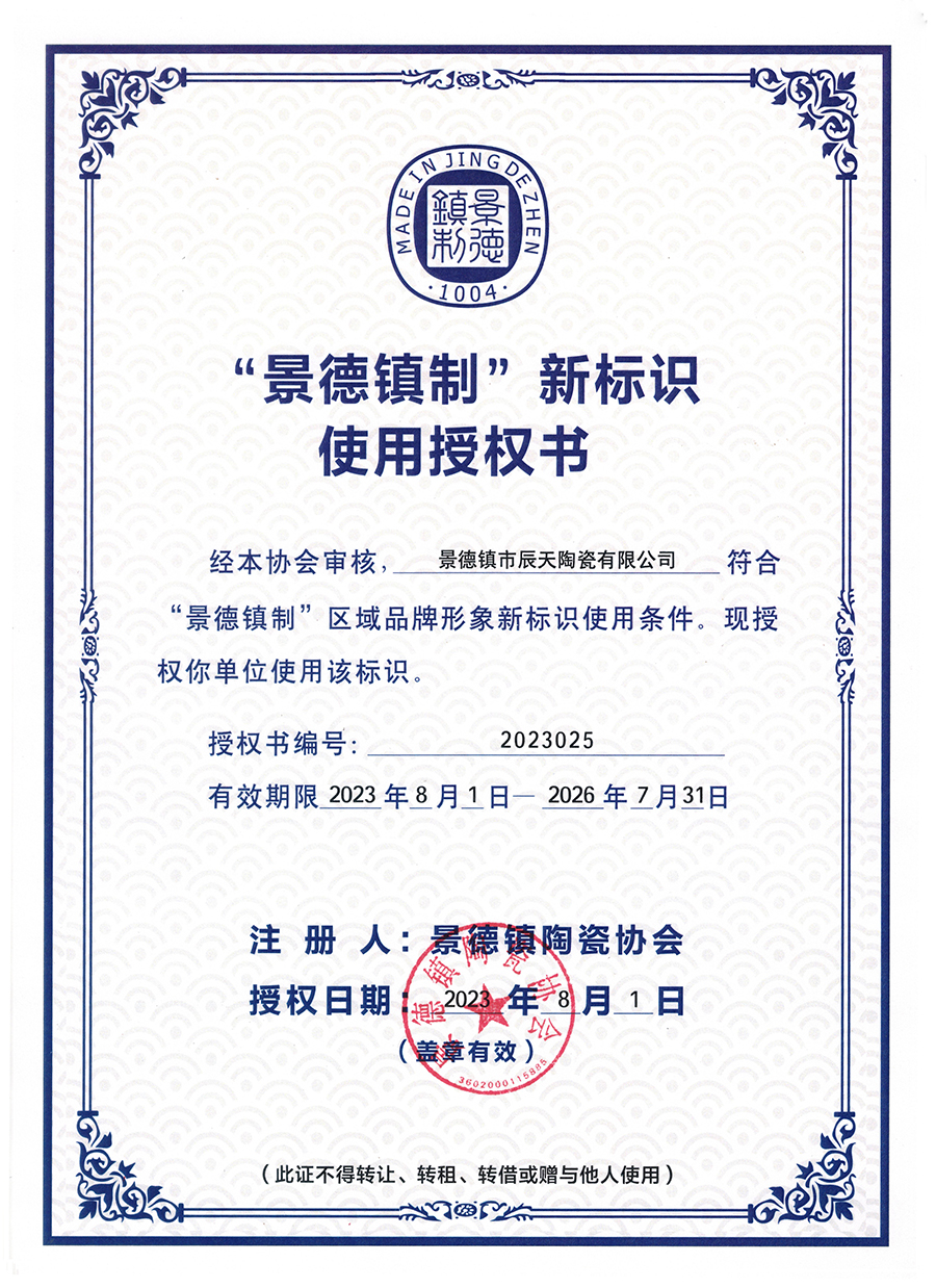 景德鎮(zhèn)市辰天陶瓷深耕陶瓷產(chǎn)業(yè)多年,是一家立足于景德鎮(zhèn)本土的陶瓷文化企業(yè)。很榮幸能得到“景德鎮(zhèn)制”新標(biāo)識使用授權(quán),在今后辰天陶瓷必將不忘初心,將傳統(tǒng)文化與現(xiàn)代創(chuàng)新相結(jié)合,為景德鎮(zhèn)陶瓷文化的發(fā)展貢獻出自己的一份微薄之力。