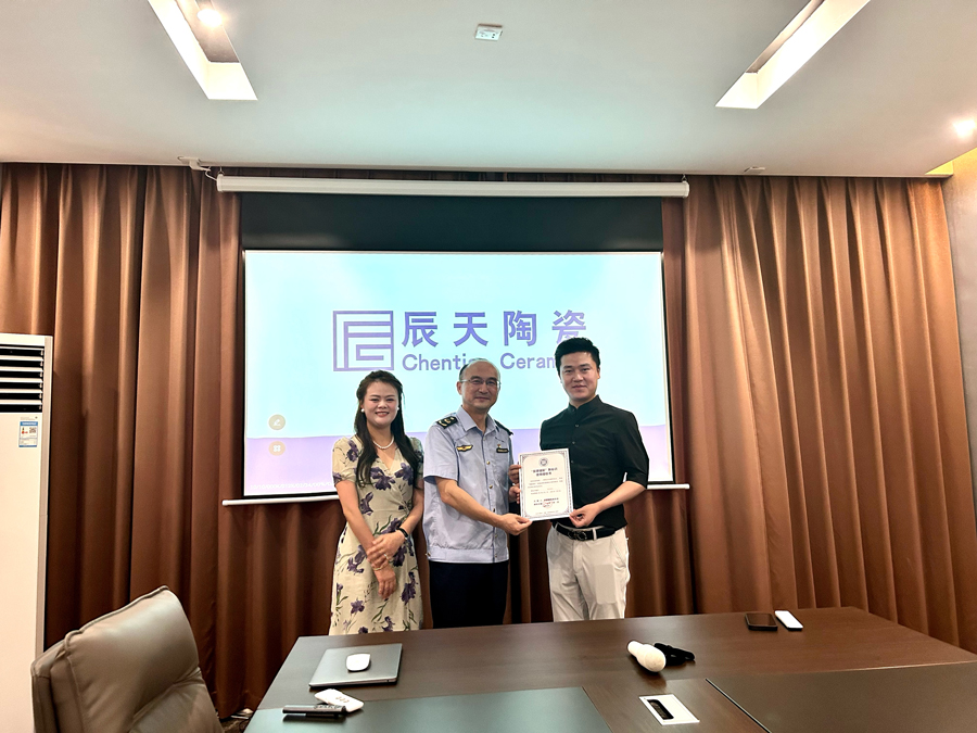 2023年8月25日下午,由景德鎮(zhèn)市市場監(jiān)督管理局副局長、陶瓷協(xié)會秘書長林春杰頒發(fā)授予《“景德鎮(zhèn)制”新標(biāo)識使用授權(quán)書》送至景德鎮(zhèn)市辰天陶瓷董事長高劍偉、總經(jīng)理許婉手中,并指導(dǎo)新標(biāo)識使用方法與規(guī)范。